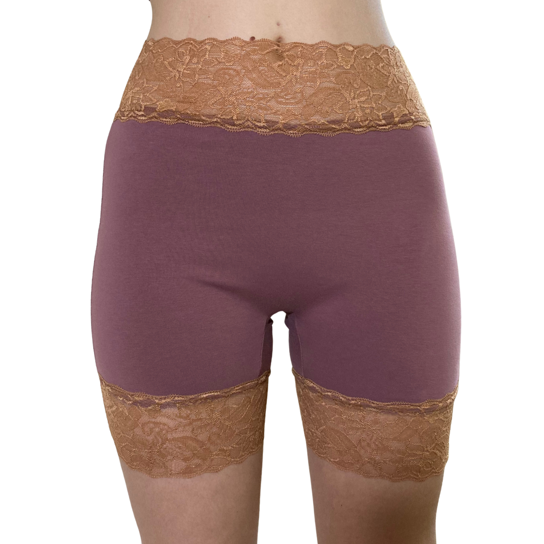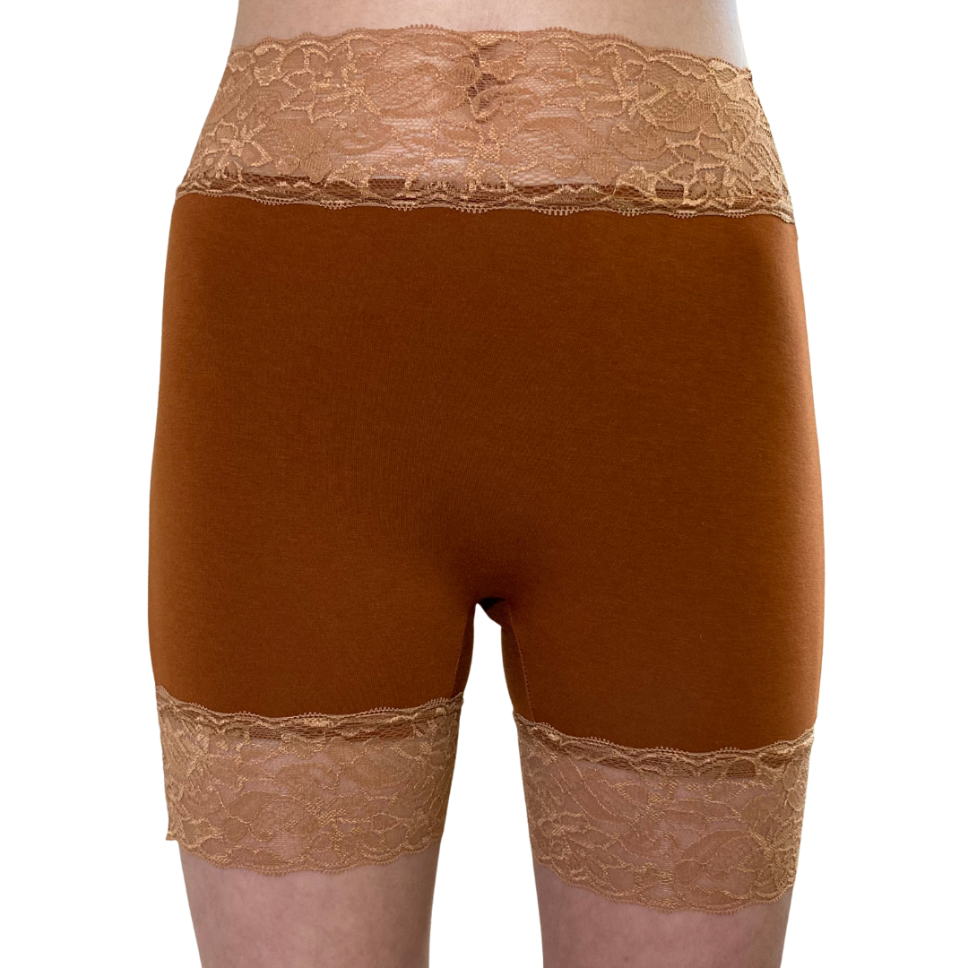 We are rather proud of these boxer style undies designed with the HYF Magic Gusset inside so that you can easily attach your reusable pads and still wear super comfy shorts style pants. The lace top is very soft and gentle on your tummy and on the legs it is comfortable and dare I say, pretty cool when worn with a short skirt.